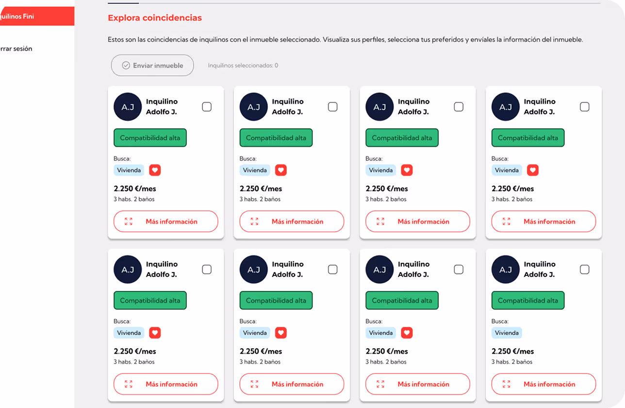 Oblida’t de la feina manual. Llogaters Fini filtra, organitza i et mostra només els millors perfils per a cada propietat, i tot això sense cap cost addicional!